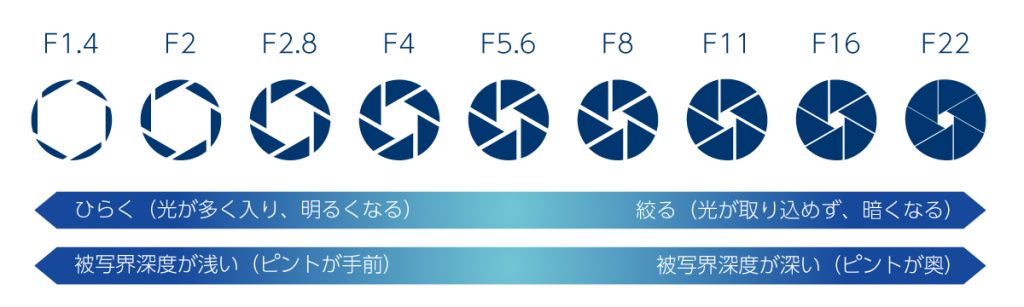 F値はレンズの絞り(光を取り込む量)とレンズ自体の明るさを表す値です。F値の値が少ないほど明るく、多いほど暗くなります。F値の値が少なく明るい時は奥行き方向のピント量(被写界深度)が浅くなり、ピンボケする画像を撮りやすくなります。F値の値が多く暗い時は奥行き方向にピントが深い画像を撮りやすくなります。