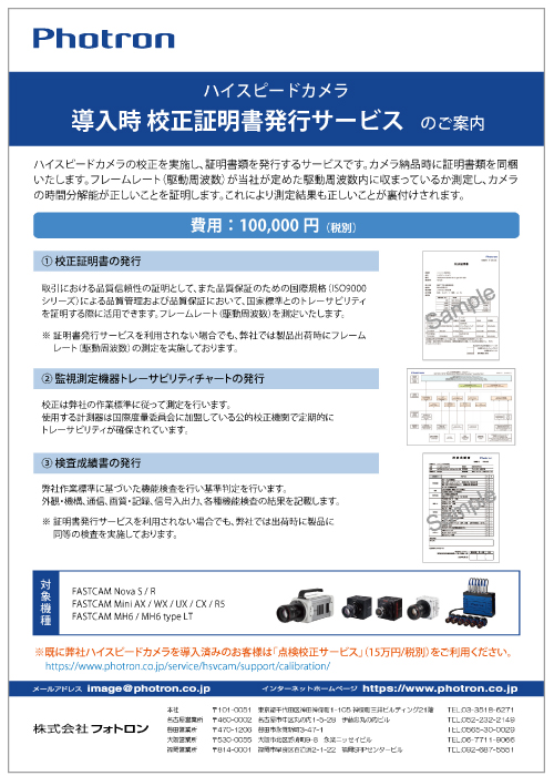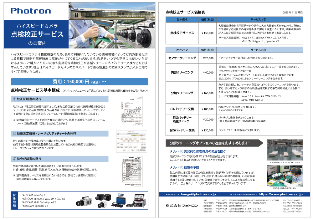 ハイスピードカメラは精密機器のため、長年ご利用いただいている使用環境によっては内外部劣化による蓄積で計測や解析精度に誤差が生じてくることがあります。