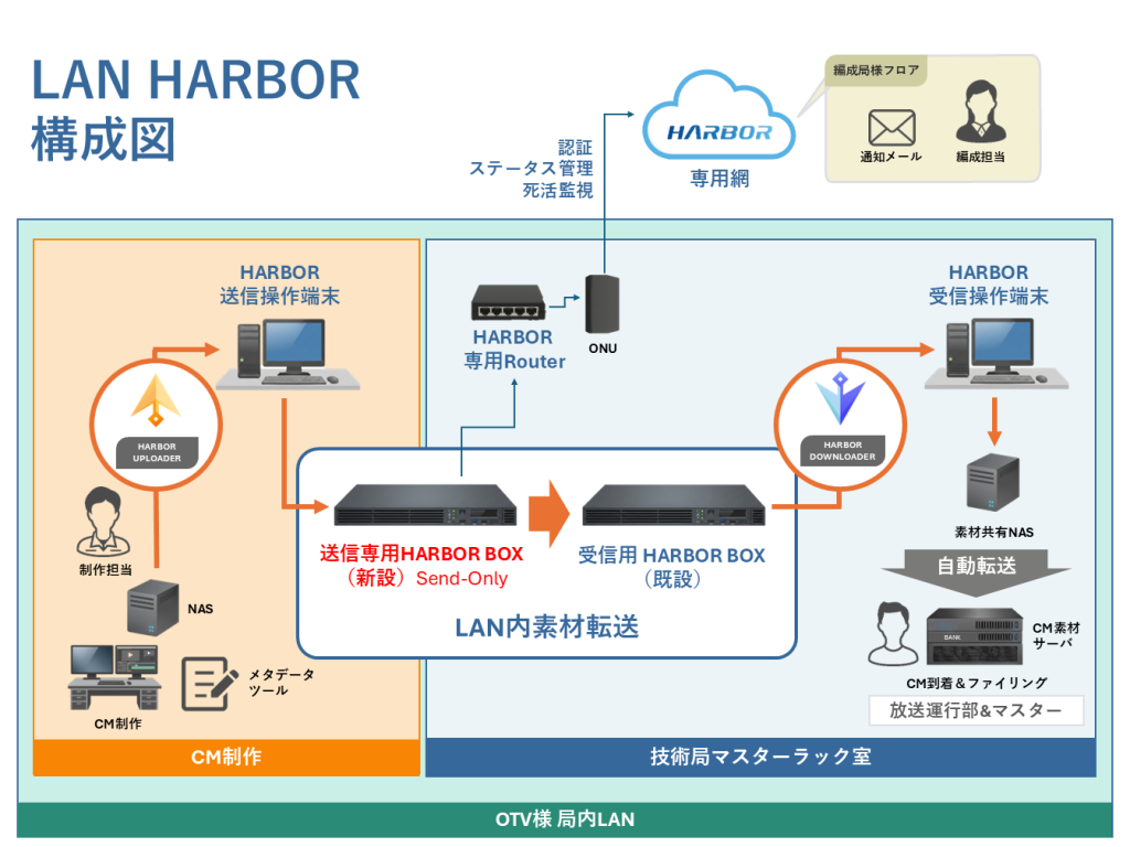 『LAN HARBOR』の特長は、データ転送経路の分離である。データ搬入時『HARBOR BOX』を介してアップロードを行い、認証のみ本土にある『HARBOR』のデータセンターで実施される。一方、実データはデータセンターのサーバを介さず、OTV局内のLAN回線を通じて『HARBOR』受信用端末へウイルスチェックのうえ直接受け渡しを行うフローとなっている。そのため、認証は物理的な距離も加味して若干のタイムラグがあるものの、実データの移動は局内で完結しているため、アップロード開始から搬入完了まで2分程度とさほど時間がかからないのが特色である。